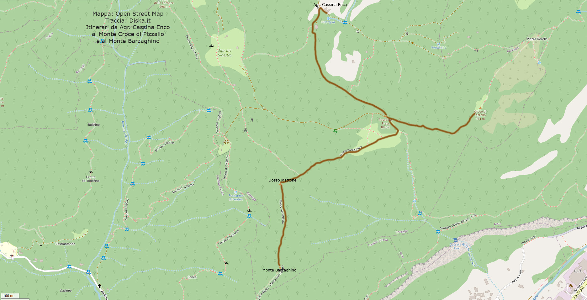 - proseguendo diritto: Monte Barzaghino a ore 0.30, Croce di Pizzallo a ore 0.15, Asso loc. Scarenna FNM a ore 0.40.