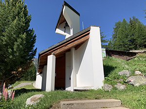 Saliamo dodici gradini in cemento, giriamo a sinistra e dopo altri otto gradini raggiungiamo una bianca chiesetta dedicata a San Carlo.