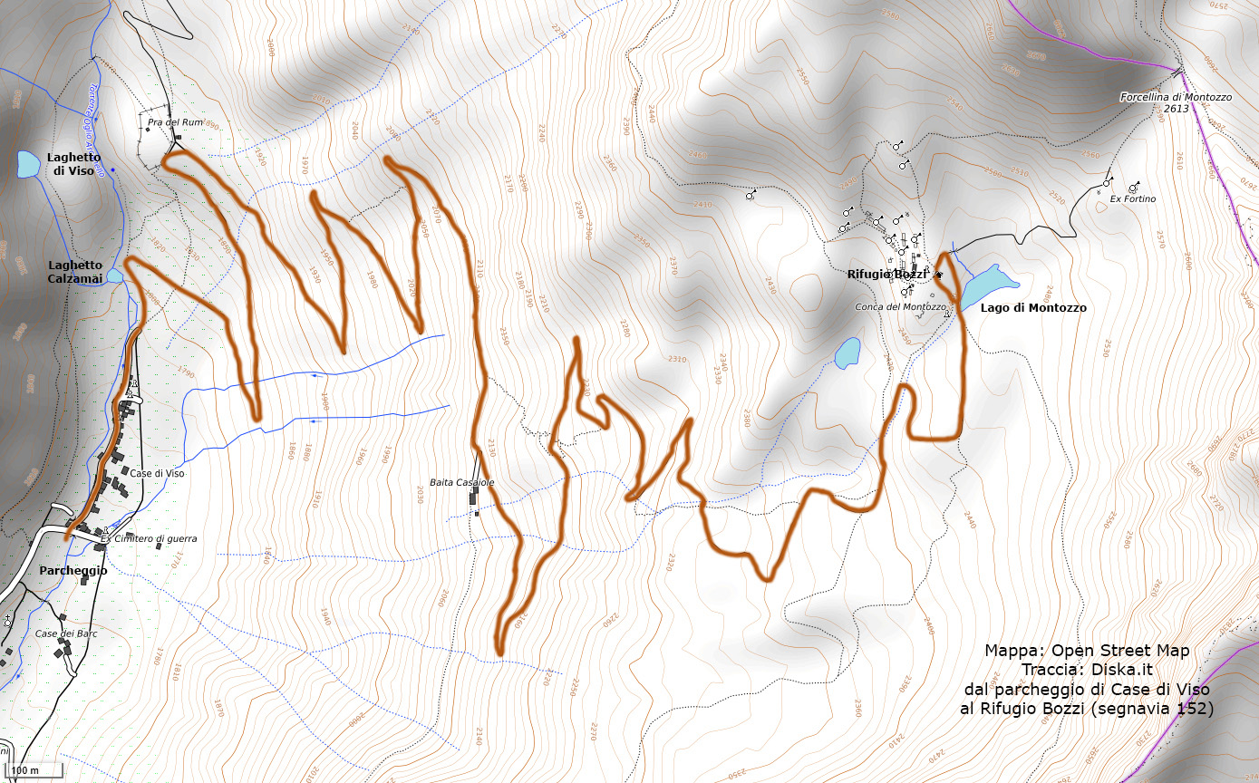 - a destra (segnavia 152-111): Rifugio Bozzi a ore 1.50, Forcellina di Montozzo a ore 2.15, Passo dei Contrabbandieri a ore 2.30;