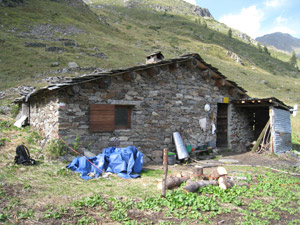Più avanti, sempre a sinistra c'è la Baita Zappello al riparo di un masso che però non ha impedito che una slavina le sfondasse il tetto in lamiera;