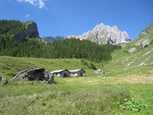 Dopo una curva a destra, lasciamo la malga alla sinistra, in fondo al prato (m. 1430). Davanti, sopra agli abeti, spuntano le chiare rocce calcaree del Pizzo Camino.