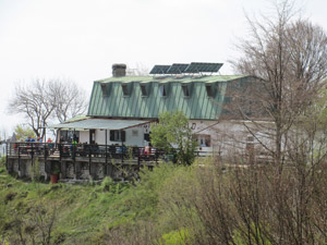 Raggiungiamo lo slargo che precede il rifugio. In alto a destra vediamo la cappelletta raggiungibile con alcuni gradini. Alla sinistra c'è un cartello