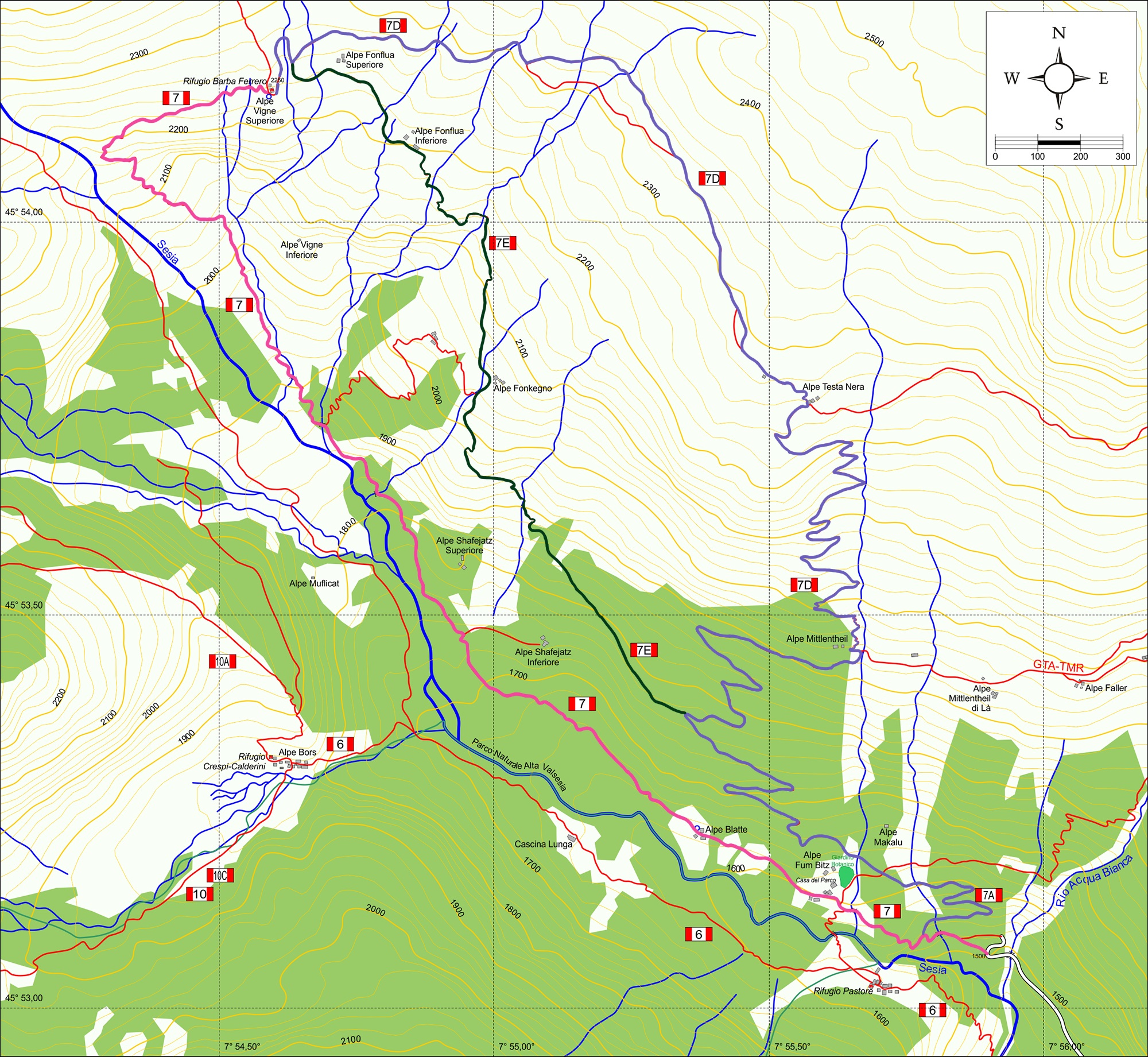 - diritto (segnavia 207): Alpe Vigne Superiore 2250 m. h. 1.45; Rifugio Barba Ferrero 2250 m.; Capanna L. Resegotti EEA 3624 m. h. 5