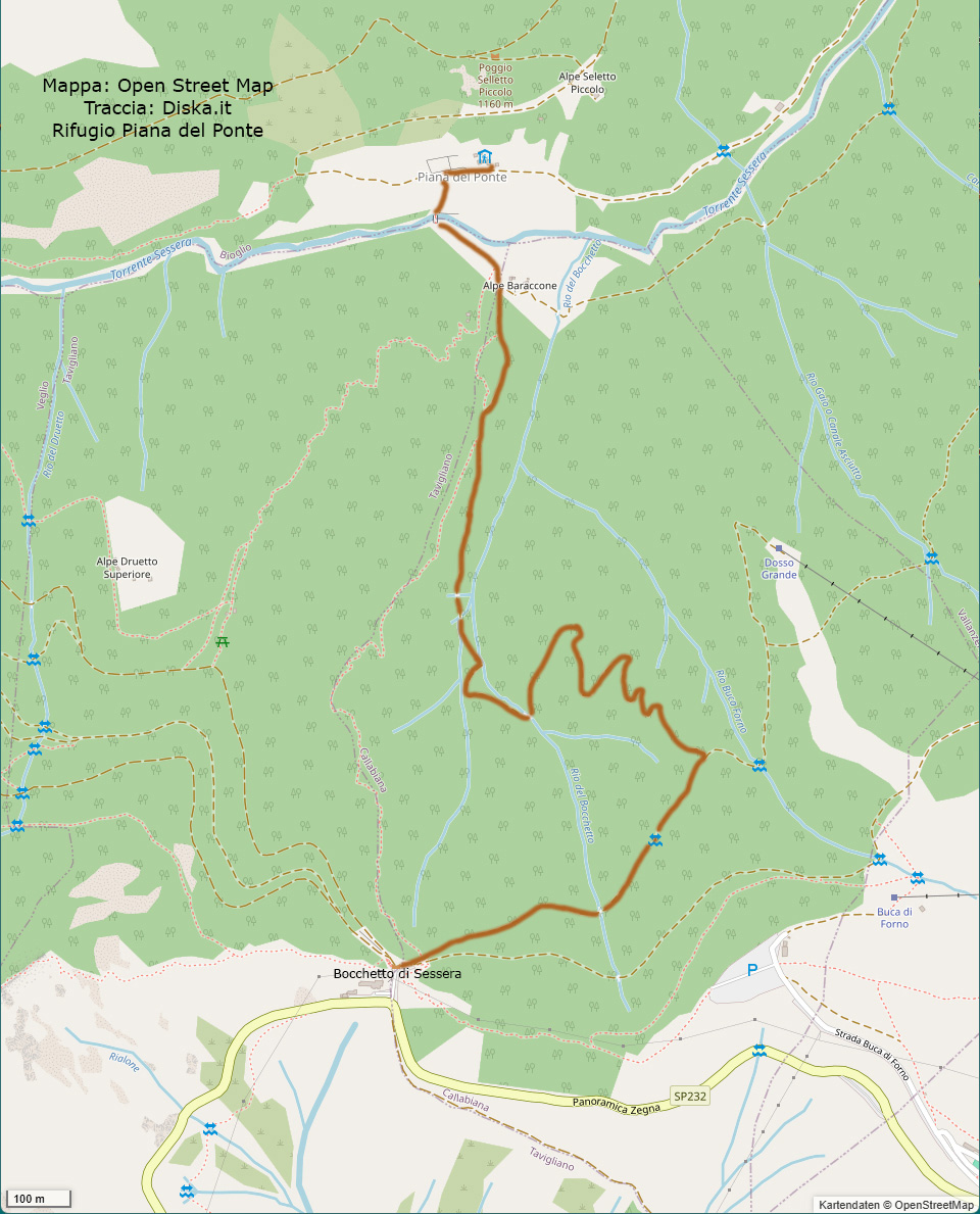 Dopo 50 metri, alla sinistra troviamo le cinque baite dell'alpeggio disposte su due file. Il Rifugio Piana del Ponte è l'ultimo edificio della prima fila, accanto alla legnaia (m. 1062).
