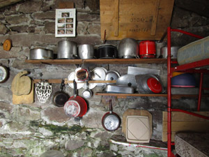 tavolo con cinque sedie e uno sgabello, armadietti con stoviglie, pentole e generi di prima necessità, una stufa economica, un camino chiuso e poca legna (su di un cartello