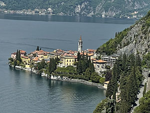 Incrociamo una stradina acciottolata. Un cartello indica Varenna davanti; un altro da il benvenuto a Perledo a coloro che salgono. Continuiamo in